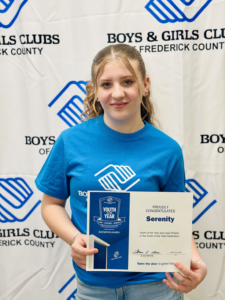 We are proud to announce our Junior Youth of the Year winners as Serenity (7-8th grade) and Tra’Maine (5-6th grade)! They each received a gift card thanks to support from Middletown Valley Bank, and a Boys & Girls Club em(brace)let from Colonial Jewelers in recognition of their accomplishments.